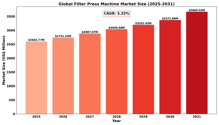 The global Filter Press Machine Market was valued at approximately US$ 2,602.77 million in 2024 and is projected to reach US$ 3,669.44 million by 2031, growing at a CAGR of 5.32% from 2025 to 2031. The market growth is driven by increased demand in wastewater treatment, industrial filtration processes, and advancements in filtration technology.