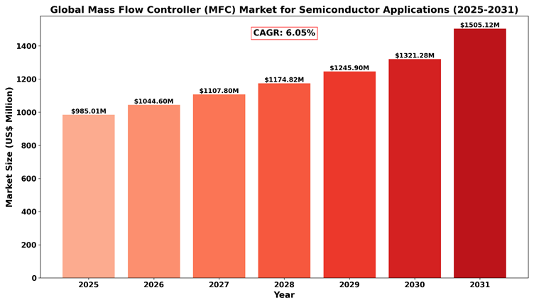 The global Mass Flow Controller (MFC) for Semiconductor Market applications was valued at approximately USD 985.01 million in 2024. It is projected to reach USD 1,505.12 million by 2031, growing at a compound annual growth rate (CAGR) of 6.05% during the forecast period from 2025 to 2031. This growth is attributed to the expanding semiconductor industry, technological advancements in fabrication processes, and increasing demand for high-performance electronic devices. Historically, the market has shown a consistent upward trend due to advancements in miniaturization and integration in semiconductor devices, further driving the need for precise gas flow control solutions.