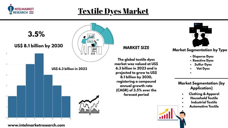 세계 섬유 염료 시장은 2023년 미화 63억 달러 규모였으며, 2030년까지 81억 달러로 성장하여 예측 기간 동안 연평균 성장률(CAGR) 3.5%를 기록할 것으로 예상됩니다. 2018년부터 2023년까지의 과거 데이터는 특히 아시아 태평양 지역을 중심으로 세계 섬유 생산량 증가에 힘입어 수요가 꾸준히 증가하고 있음을 보여줍니다. https://www.intelmarketresearch.com/download-free-sample/835/textile-dyes-market 에서 이 보고서의 무료 샘플을 받아보세요. 섬유 염료 시장은 섬유 소재에 사용하도록 특별히 제조된 착색제의 생산, 유통 및 적용에 전념하는 글로벌 산업을 지칭합니다. 섬유 염료는 직물에 색상을 부여하는 화합물 로, 의류,..